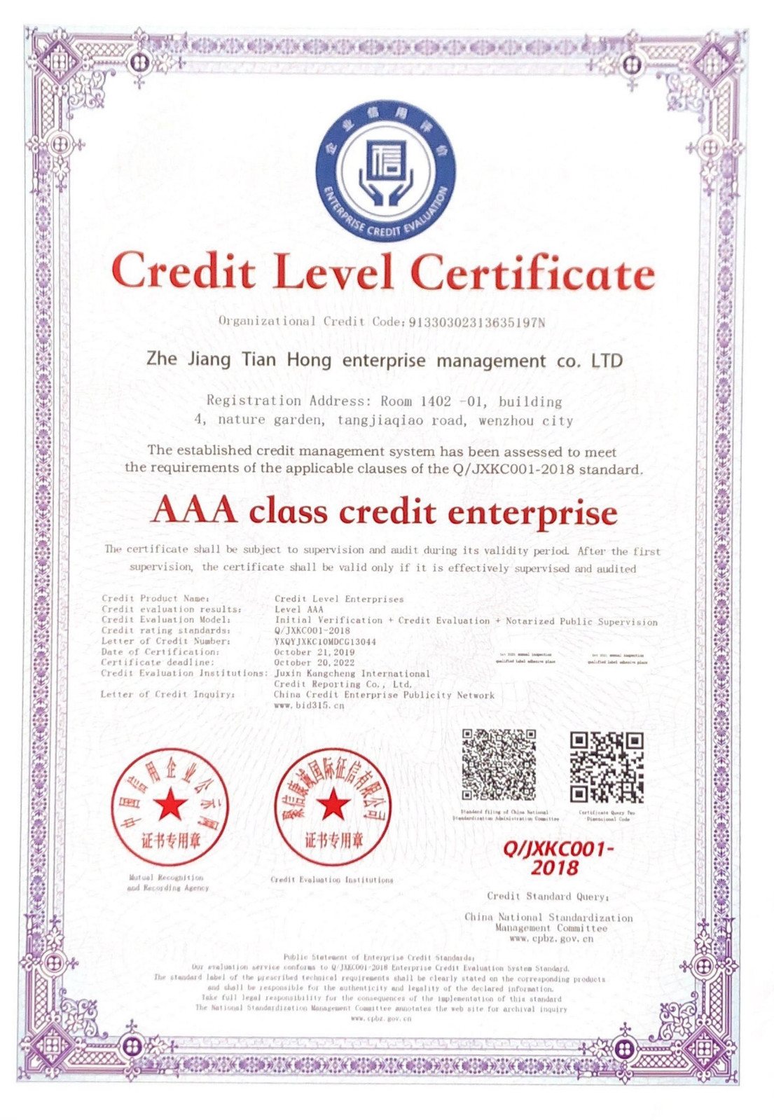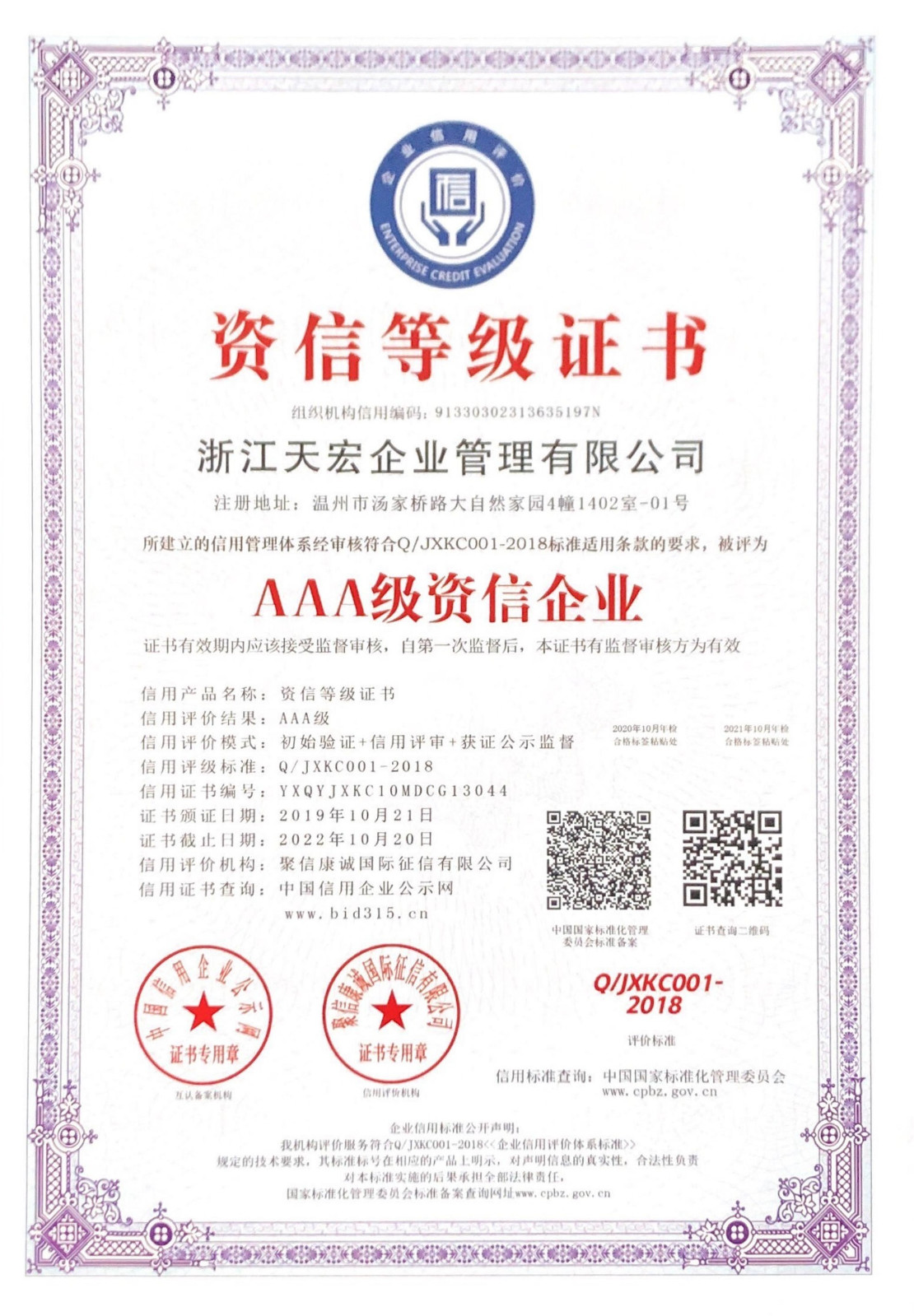 浙江天宏資信AAA等級證